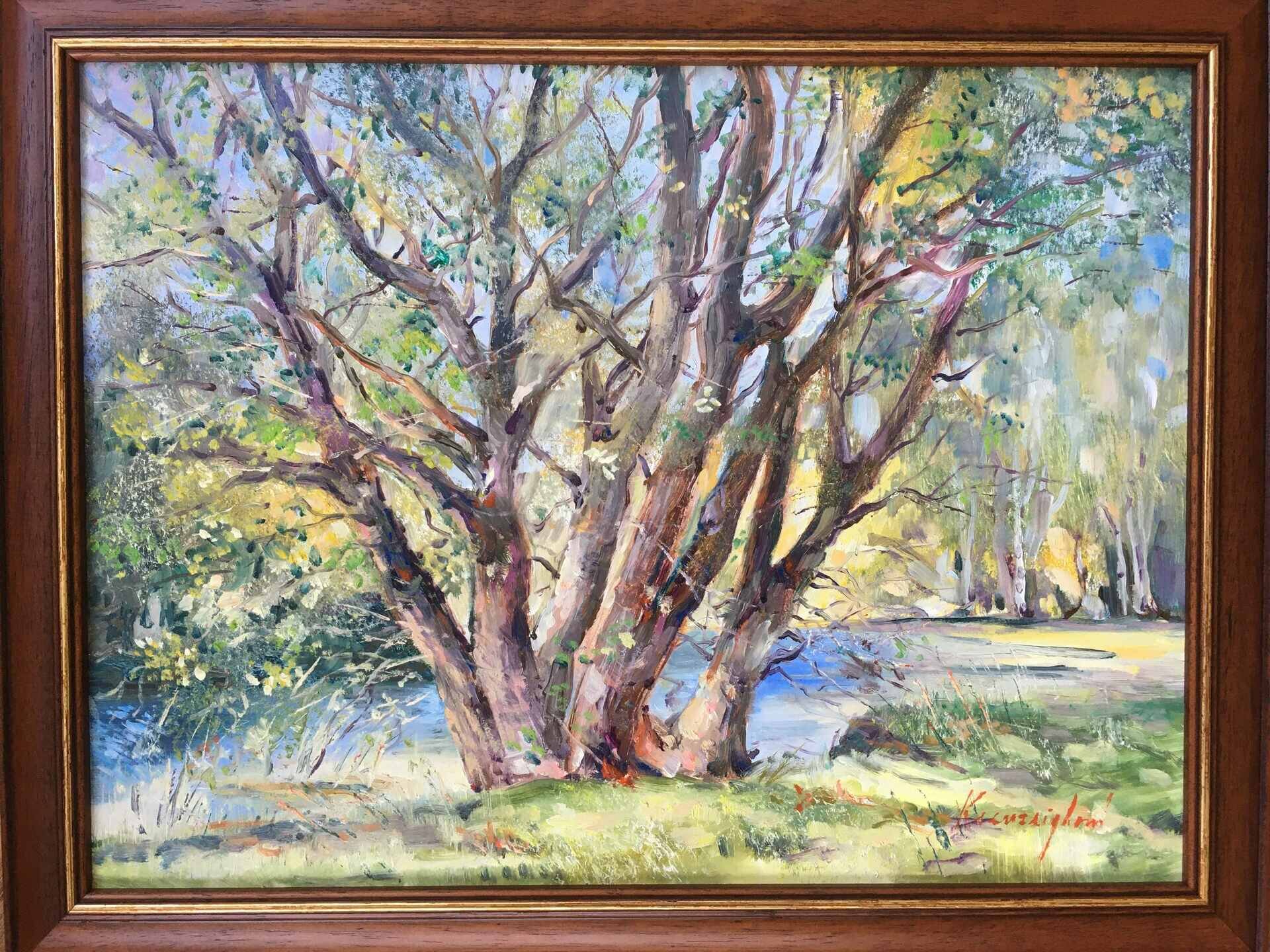 Olejomaľba, Ester Ksenzsigh, Strom pri rieke, 40x30 cm